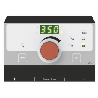 Koncept ovládania: BasicPlus – jednoduchý panel s plynulým nastavením prúdu a predvoľbami pre rôzne typy elektród (rutile, bazické, CEL).
